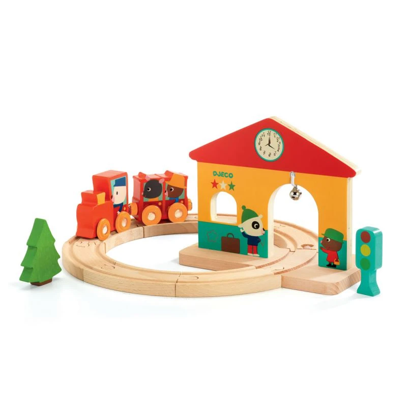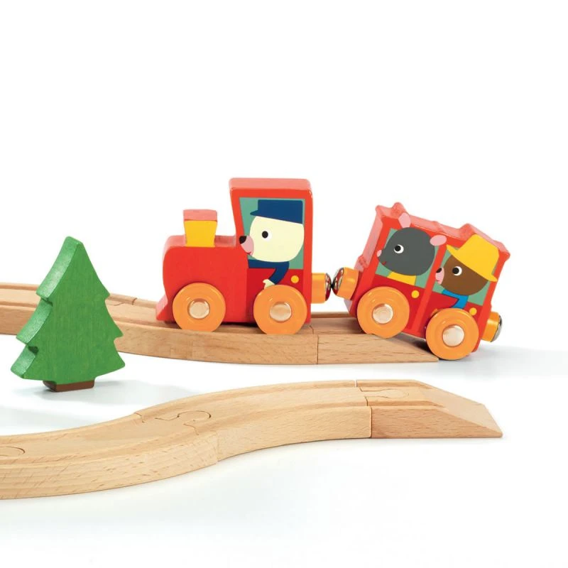 Minitrain est un circuit de petit train en bois de la marque Djeco. Il est composé d’un joli train avec son wagon raccordé magnétiquement. de 10 rails dont une petite gare, d’un feu tricolore et d’un sapin. La gare est équipée d’une petite clochette qui tintera lorsque le train passera devant le chef de gare. Ce jouet favorisera l’imagination des enfants tout en leur faisant travailler leur dextérité. Il pourront au choix créer un circuit rond fermé ou un circuit ouvert afin que le train puisse poursuivre sa route vers d’autres jouets comme par exemple la mini ferme de Djeco.